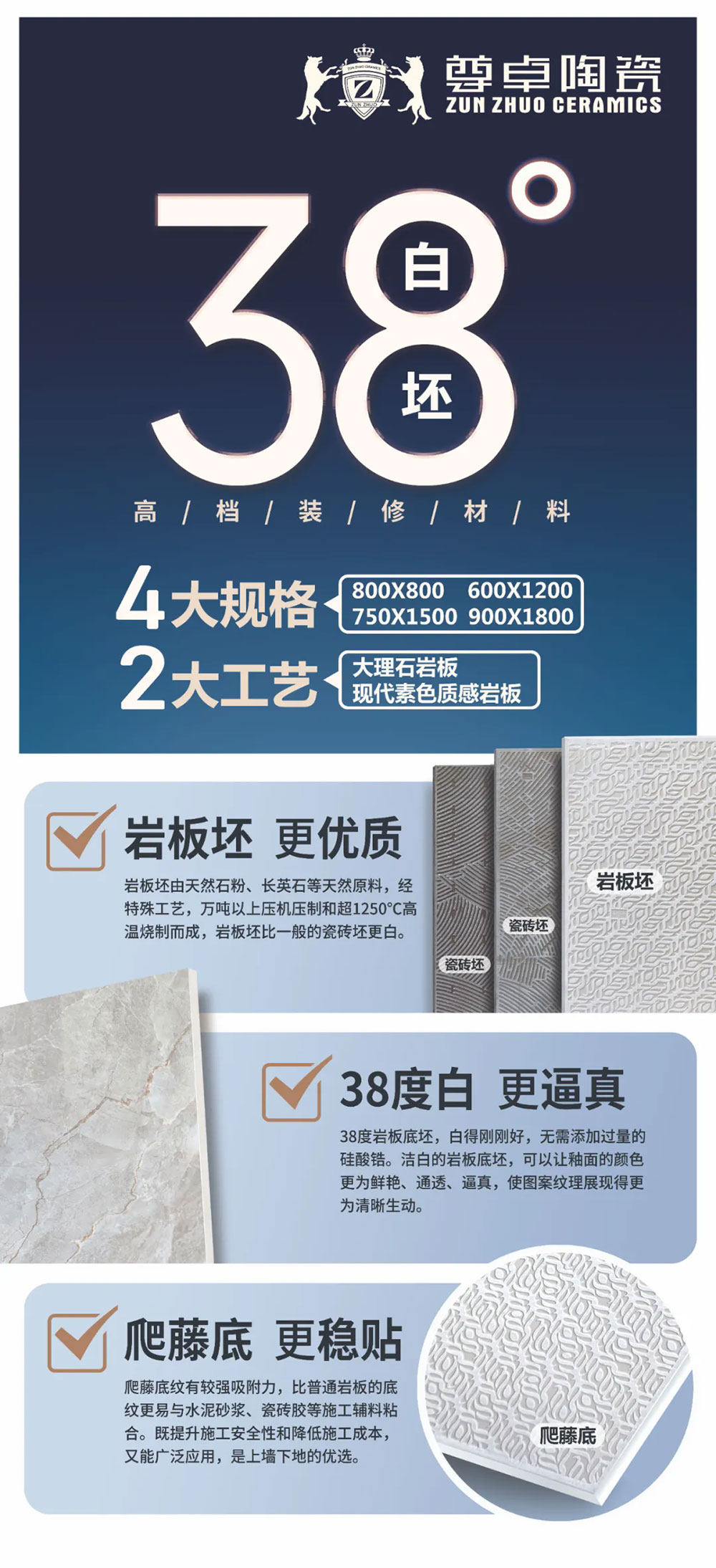 為保證純白度,尊卓陶瓷從原材料開始便精選質(zhì)長(zhǎng)石粉、白泥,嚴(yán)格執(zhí)行數(shù)十道除鐵工序,經(jīng)超1250℃高溫慢燒、燒透,坯體遠(yuǎn)白于市面上一般釉面磚坯。